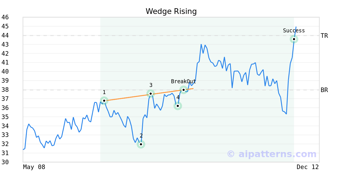 On September 08, 2025, A.I.dvisor detected a Wedge Rising Pattern (Bullish) for Kulicke and Soffa Industries (KLIC, $37.96). On September 08, 2025, A.I.dvisor confirmed the Bullish pattern, setting a target price of $43.97. 78 days later, on November 25, 2025, KLIC reached the target price resulting in a +1 for traders who took a long position in the stock.