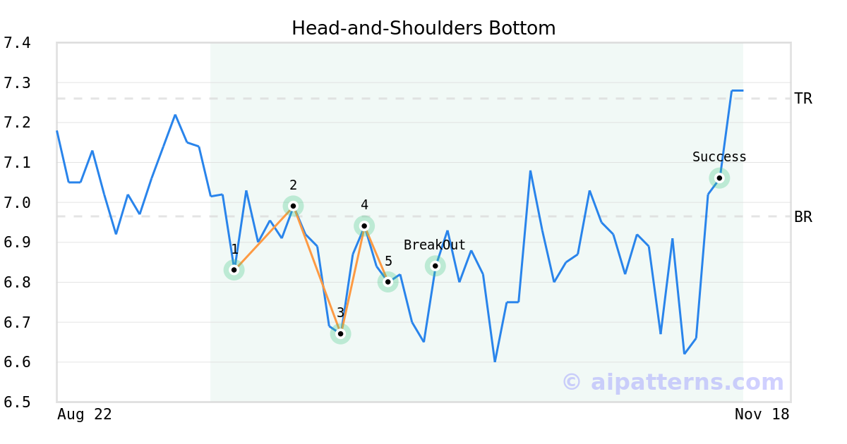 On October 02, 2025, A.I.dvisor detected a Head-and-Shoulders Bottom Pattern (Bullish) for Kamada Ltd (KMDA, $6.80). On October 08, 2025, A.I.dvisor confirmed the Bullish pattern, setting a target price of $7.26. 34 days later, on November 11, 2025, KMDA reached the target price resulting in a for traders who took a long position in the stock.