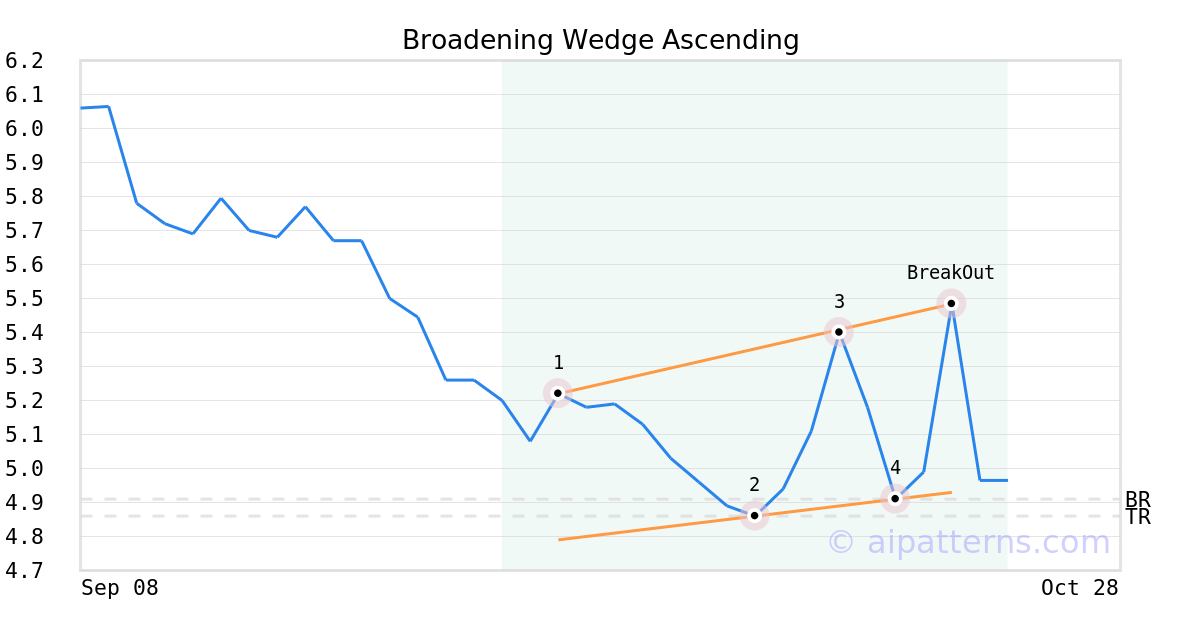 On October 21, 2025, A.I.dvisor detected a Broadening Wedge Ascending Pattern (Bearish) for Koss Corp (KOSS, $5.48). On October 21, 2025, A.I.dvisor confirmed the Bearish pattern, setting a target price of the stock. On October 21, 2025, the stock hit the target price of $4.86 – resulting in a gain for traders who shorted the stock on the pattern detection date.