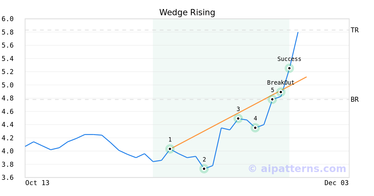 On November 21, 2025, A.I.dvisor detected a Wedge Rising Pattern (Bullish) for KORU Medical Systems (KRMD, $4.78). On November 24, 2025, A.I.dvisor confirmed the Bullish pattern, setting a target price of $5.83. 1 day later, on November 25, 2025, KRMD reached the target price resulting in a for traders who took a long position in the stock.