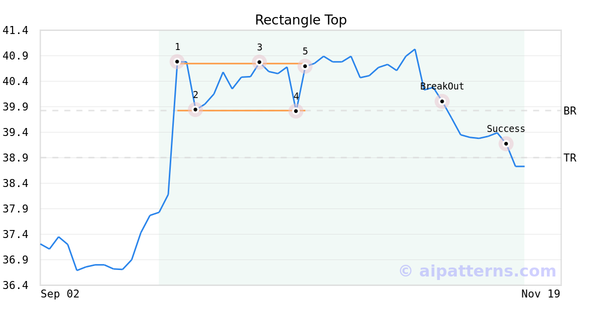 On October 13, 2025, A.I.dvisor detected a Rectangle Top Pattern (Bearish) for iShares MSCI Saudi Arabia ETF (KSA, $40.69). 21 days later, on November 03, 2025, A.I.dvisor confirmed the Bearish pattern, setting a target price of the stock. On November 12, 2025, the stock hit the target price of $38.90 – resulting in a gain for traders who shorted the stock on the pattern detection date.
