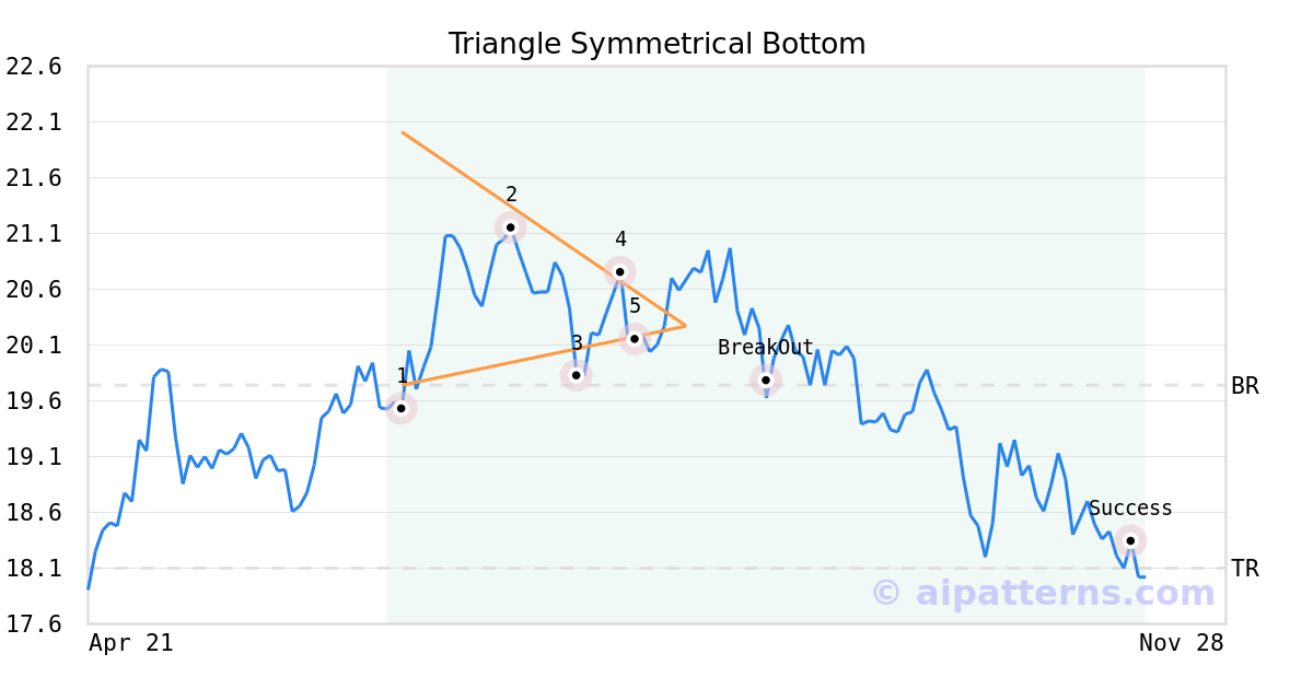 On August 07, 2025, A.I.dvisor detected a Triangle Symmetrical Bottom Pattern (Bearish) for KT Corp. (KT, $20.15). 26 days later, on September 02, 2025, A.I.dvisor confirmed the Bearish pattern, setting a target price of the stock. On November 11, 2025, the stock hit the target price of $18.10 – resulting in a gain for traders who shorted the stock on the pattern detection date.