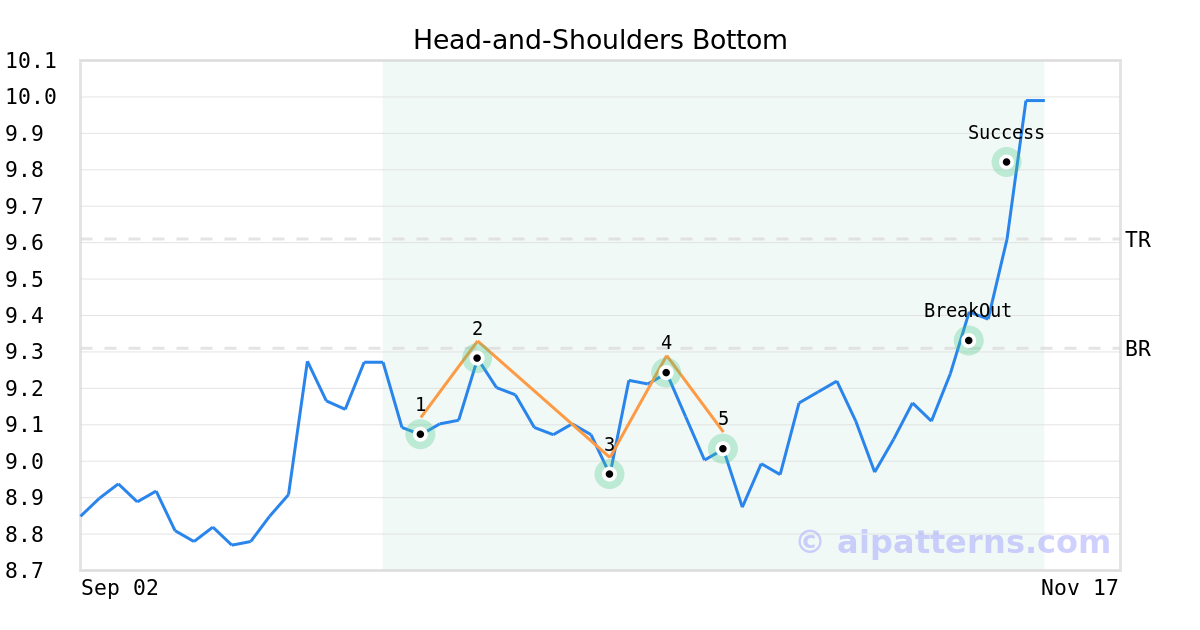 On October 20, 2025, A.I.dvisor detected a Head-and-Shoulders Bottom Pattern (Bullish) for Gladstone Land Corp (LAND, $9.03). On November 06, 2025, A.I.dvisor confirmed the Bullish pattern, setting a target price of $9.61. 4 days later, on November 10, 2025, LAND reached the target price resulting in a for traders who took a long position in the stock.