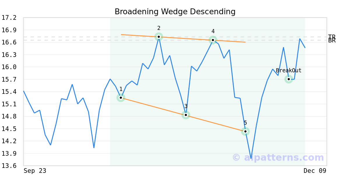 On November 19, 2025, A.I.dvisor detected a Broadening Wedge Descending Pattern (Bullish) for Lands' End (LE, $14.43). On December 02, 2025, A.I.dvisor confirmed the Bullish pattern, setting a target price of $16.73. On December 02, 2025, LE reached the target price resulting in a for traders who took a long position in the stock.