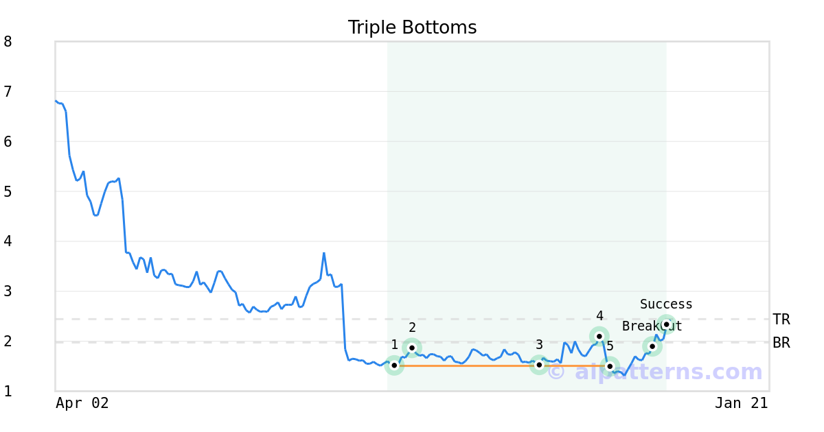 On November 14, 2025, A.I.dvisor detected a Triple Bottoms Pattern (Bullish) for Pulmonx Corp (LUNG, $1.49). On December 03, 2025, A.I.dvisor confirmed the Bullish pattern, setting a target price of $2.44. 6 days later, on December 09, 2025, LUNG reached the target price resulting in a +5 for traders who took a long position in the stock.