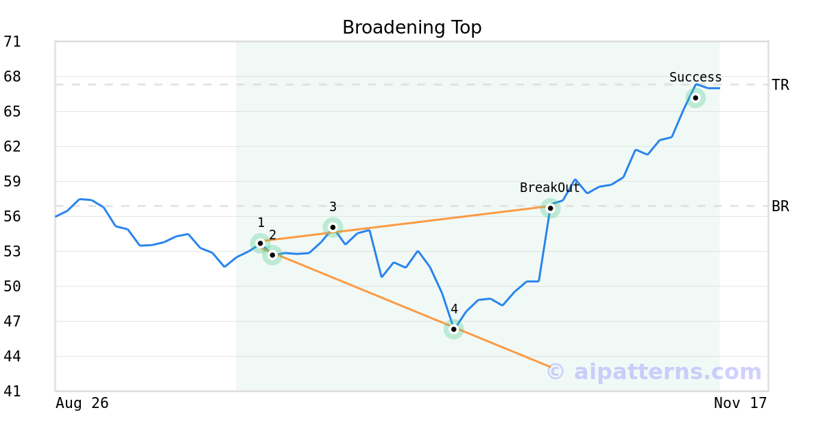 On October 23, 2025, A.I.dvisor detected a Broadening Top Pattern (Bullish) for Las Vegas Sands Corp (LVS, $56.66). On October 23, 2025, A.I.dvisor confirmed the Bullish pattern, setting a target price of $67.31. 18 days later, on November 10, 2025, LVS reached the target price resulting in a +1 for traders who took a long position in the stock.