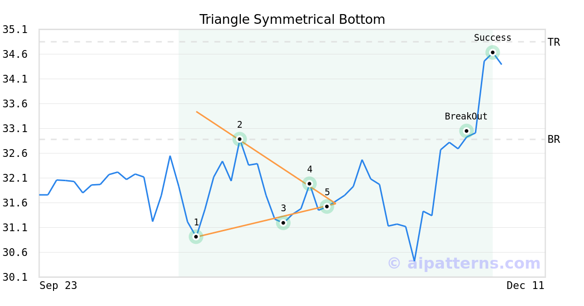 On November 07, 2025, A.I.dvisor detected a Triangle Symmetrical Bottom Pattern (Bullish) for Merchants Bancorp (MBIN, $31.52). On December 01, 2025, A.I.dvisor confirmed the Bullish pattern, setting a target price of $34.85. 3 days later, on December 04, 2025, MBIN reached the target price resulting in a for traders who took a long position in the stock.