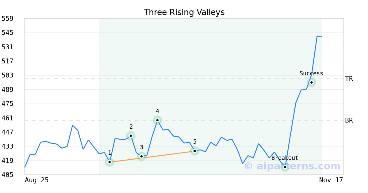 On October 09, 2025, A.I.dvisor detected a Three Rising Valleys Pattern (Bullish) for Madrigal Pharmaceuticals (MDGL, $428.30). On November 03, 2025, A.I.dvisor confirmed the Bullish pattern, setting a target price of $499.89. 7 days later, on November 10, 2025, MDGL reached the target price resulting in a +1 for traders who took a long position in the stock.