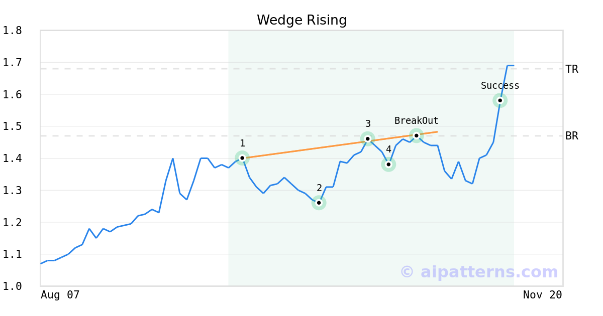 On October 23, 2025, A.I.dvisor detected a Wedge Rising Pattern (Bullish) for Mesa Air Group (MESA, $1.47). On October 23, 2025, A.I.dvisor confirmed the Bullish pattern, setting a target price of $1.68. 18 days later, on November 10, 2025, MESA reached the target price resulting in a for traders who took a long position in the stock.