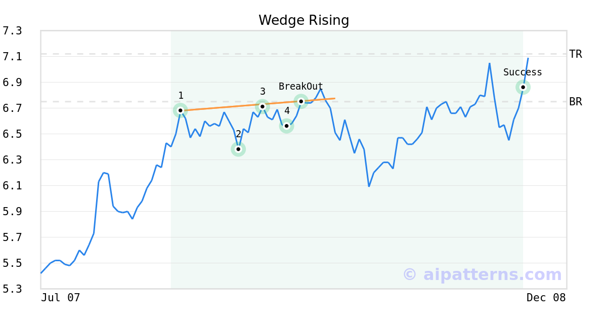 On September 22, 2025, A.I.dvisor detected a Wedge Rising Pattern (Bullish) for Mizuho Financial Group (MFG, $6.75). On September 22, 2025, A.I.dvisor confirmed the Bullish pattern, setting a target price of $7.12. 64 days later, on November 25, 2025, MFG reached the target price resulting in a for traders who took a long position in the stock.