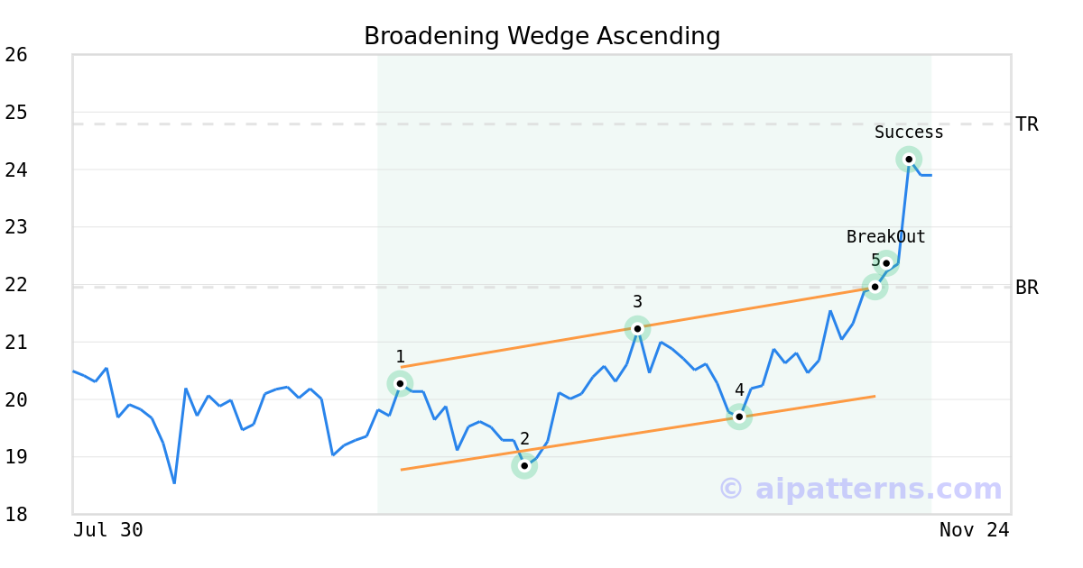 On November 07, 2025, A.I.dvisor detected a Broadening Wedge Ascending Pattern (Bullish) for Magic Software Enterprises Ltd (MGIC, $21.95). On November 10, 2025, A.I.dvisor confirmed the Bullish pattern, setting a target price of $24.79. 2 days later, on November 12, 2025, MGIC reached the target price resulting in a +1 for traders who took a long position in the stock.