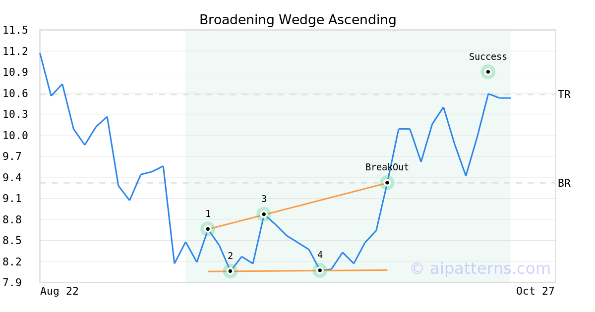 On October 07, 2025, A.I.dvisor detected a Broadening Wedge Ascending Pattern (Bullish) for MIND Technology (MIND, $9.32). On October 07, 2025, A.I.dvisor confirmed the Bullish pattern, setting a target price of $10.58. 13 days later, on October 20, 2025, MIND reached the target price resulting in a +1 for traders who took a long position in the stock.