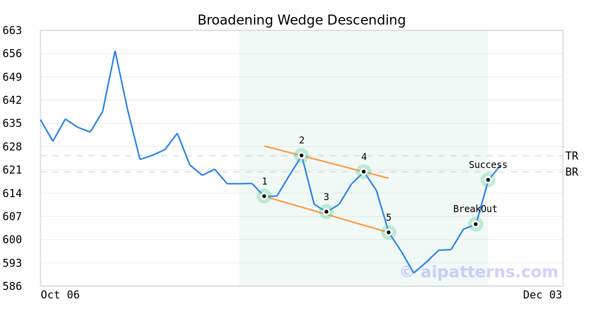 On November 13, 2025, A.I.dvisor detected a Broadening Wedge Descending Pattern (Bullish) for Martin Marietta Materials (MLM, $602.13). On November 24, 2025, A.I.dvisor confirmed the Bullish pattern, setting a target price of $625.26. 1 day later, on November 25, 2025, MLM reached the target price resulting in a for traders who took a long position in the stock.
