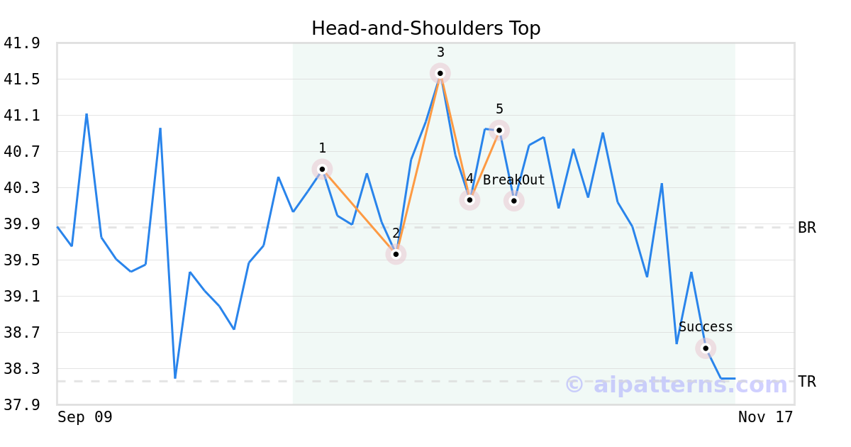 On October 21, 2025, A.I.dvisor detected a Head-and-Shoulders Top Pattern (Bearish) for Miller Industries (MLR, $40.93). 1 day later, on October 22, 2025, A.I.dvisor confirmed the Bearish pattern, setting a target price of the stock. On November 10, 2025, the stock hit the target price of $38.16 – resulting in a gain for traders who shorted the stock on the pattern detection date.