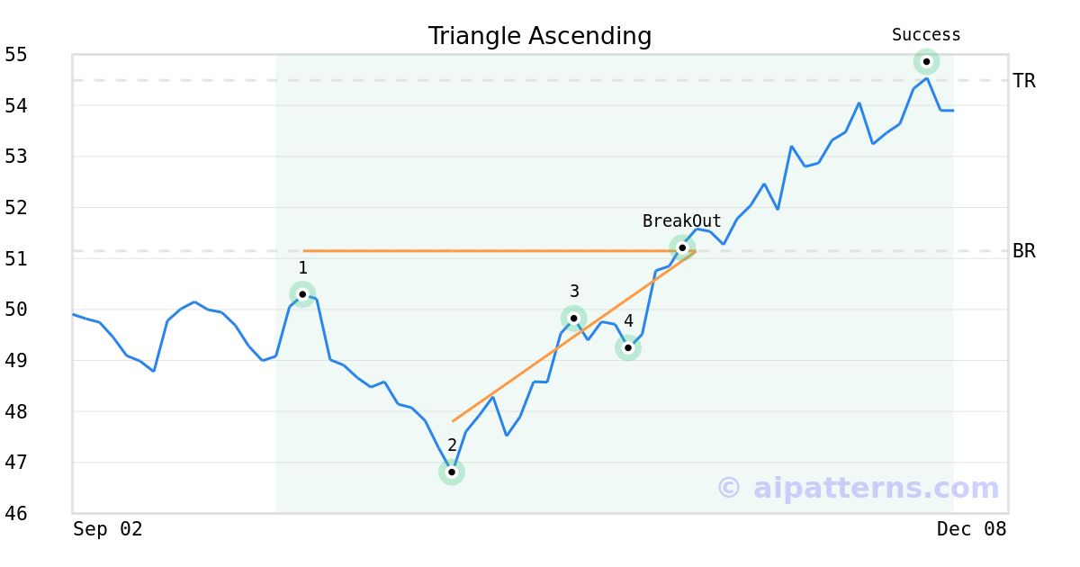 On November 04, 2025, A.I.dvisor detected a Triangle Ascending Pattern (Bullish) for Mplx LP (MPLX, $50.13). On November 04, 2025, A.I.dvisor confirmed the Bullish pattern, setting a target price of $54.49. 27 days later, on December 01, 2025, MPLX reached the target price resulting in a for traders who took a long position in the stock.