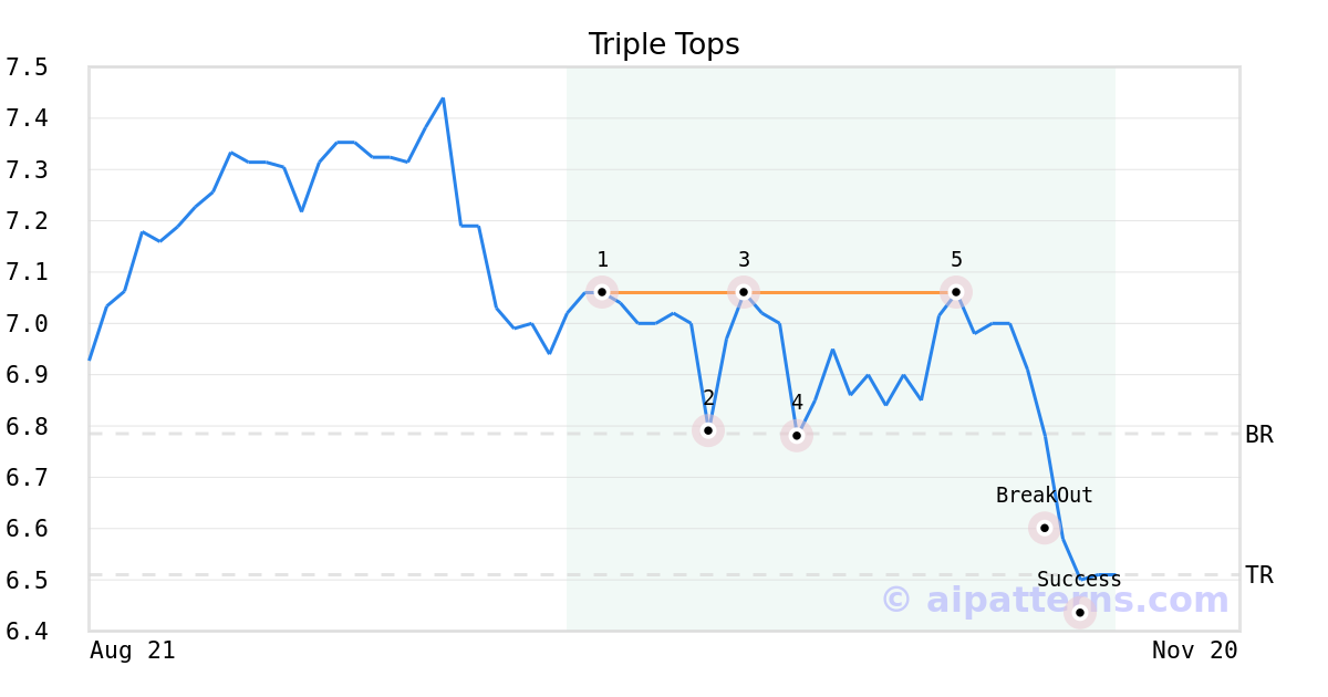 On October 30, 2025, A.I.dvisor detected a Triple Tops Pattern (Bearish) for Monroe Capital Corp (MRCC, $7.06). 7 days later, on November 06, 2025, A.I.dvisor confirmed the Bearish pattern, setting a target price of the stock. On November 10, 2025, the stock hit the target price of $6.51 – resulting in a gain for traders who shorted the stock on the pattern detection date.