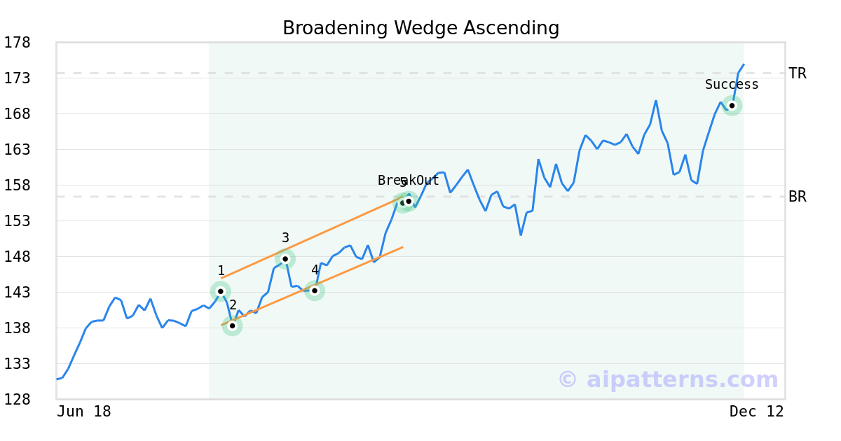 On September 12, 2025, A.I.dvisor detected a Broadening Wedge Ascending Pattern (Bullish) for Morgan Stanley (MS, $155.44). On September 15, 2025, A.I.dvisor confirmed the Bullish pattern, setting a target price of $173.69. 78 days later, on December 02, 2025, MS reached the target price resulting in a for traders who took a long position in the stock.