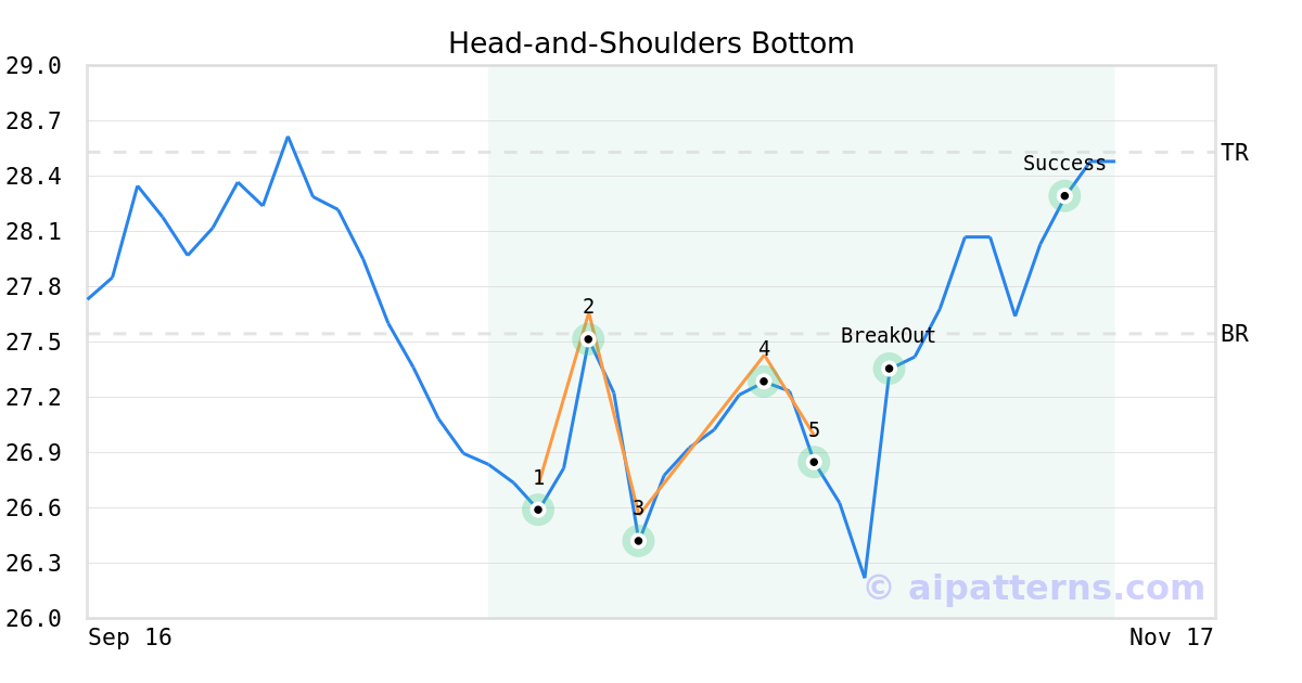 On October 27, 2025, A.I.dvisor detected a Head-and-Shoulders Bottom Pattern (Bullish) for MGIC Investment Corp (MTG, $26.85). On October 30, 2025, A.I.dvisor confirmed the Bullish pattern, setting a target price of $28.53. 11 days later, on November 10, 2025, MTG reached the target price resulting in a for traders who took a long position in the stock.