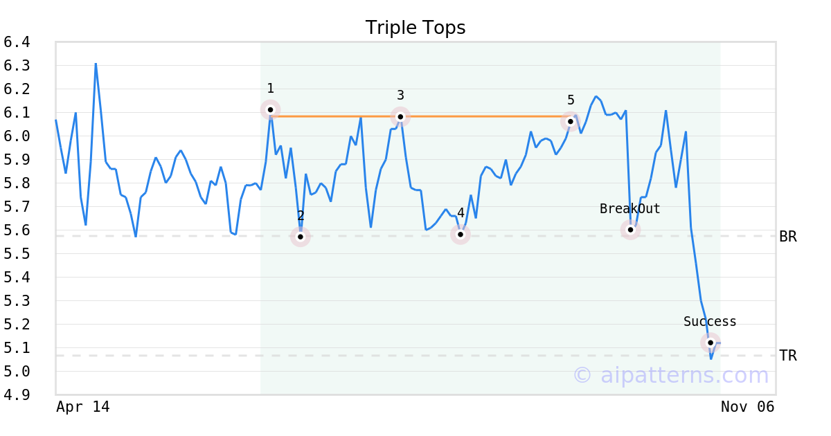 On September 11, 2025, A.I.dvisor detected a Triple Tops Pattern (Bearish) for MV Oil Trust (MVO, $5.85). 18 days later, on September 29, 2025, A.I.dvisor confirmed the Bearish pattern, setting a target price of the stock. On October 21, 2025, the stock hit the target price of $5.07 – resulting in a +1 gain for traders who shorted the stock on the pattern detection date.