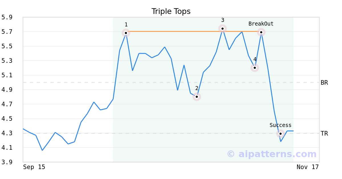 On November 05, 2025, A.I.dvisor detected a Triple Tops Pattern (Bearish) for Nephros (NEPH, $5.69). On November 05, 2025, A.I.dvisor confirmed the Bearish pattern, setting a target price of the stock. On November 10, 2025, the stock hit the target price of $4.30 – resulting in a +2 gain for traders who shorted the stock on the pattern detection date.