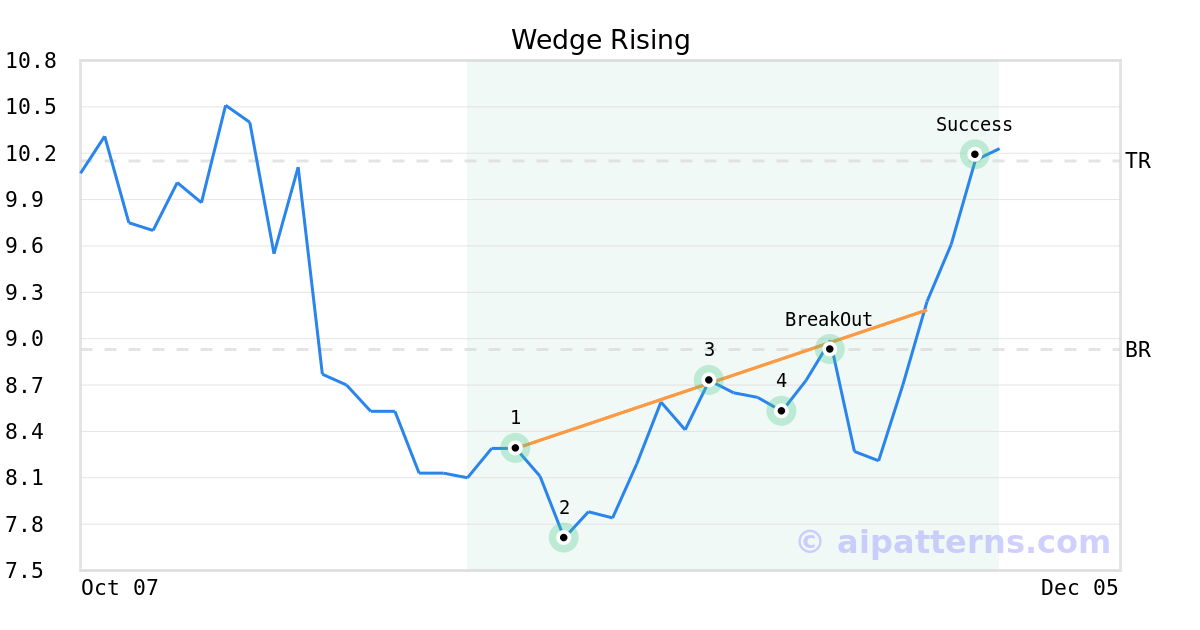 On November 19, 2025, A.I.dvisor detected a Wedge Rising Pattern (Bullish) for NovaGold Resources (NG, $8.93). On November 19, 2025, A.I.dvisor confirmed the Bullish pattern, setting a target price of $10.15. 9 days later, on November 28, 2025, NG reached the target price resulting in a +1 for traders who took a long position in the stock.