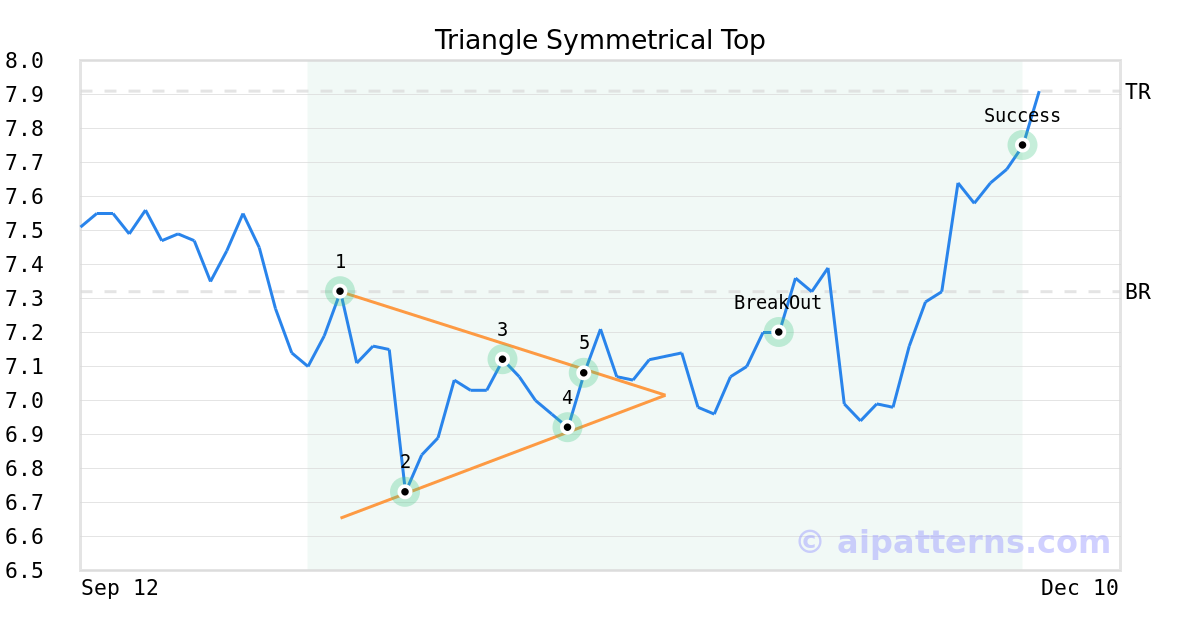 On October 27, 2025, A.I.dvisor detected a Triangle Symmetrical Top Pattern (Bullish) for Nomura Holdings (NMR, $7.08). On November 11, 2025, A.I.dvisor confirmed the Bullish pattern, setting a target price of $7.91. 22 days later, on December 03, 2025, NMR reached the target price resulting in a for traders who took a long position in the stock.