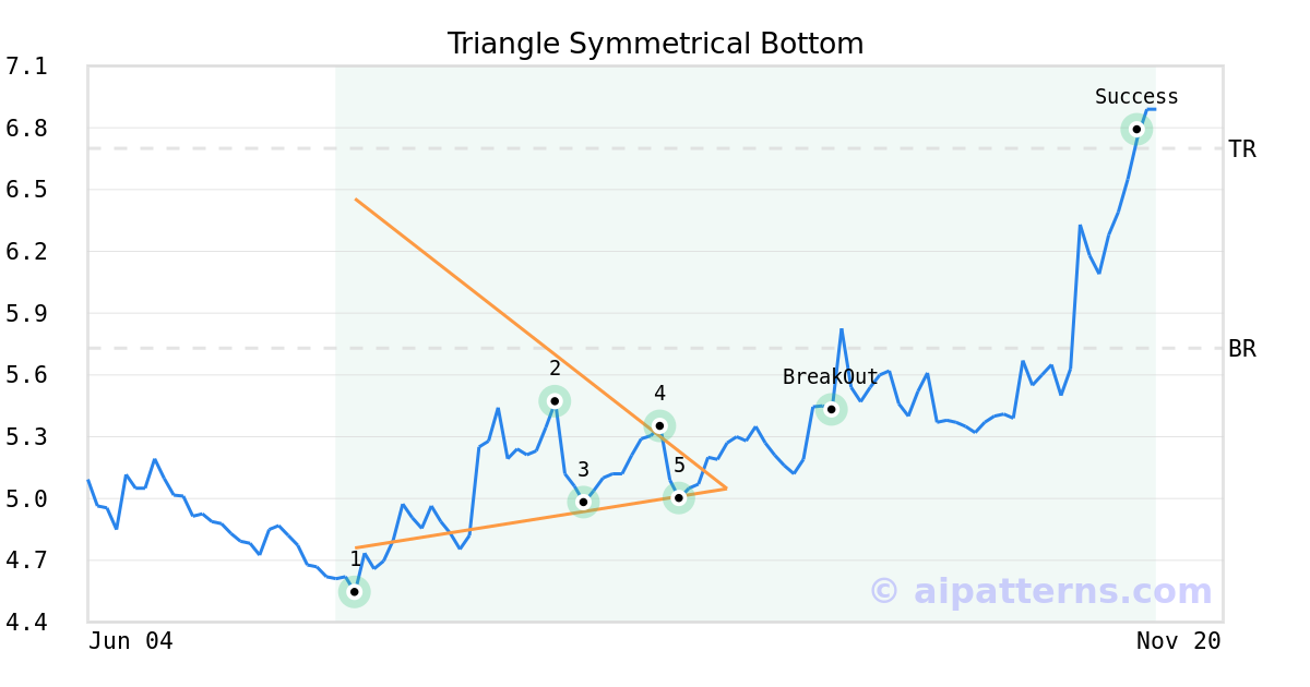 On September 03, 2025, A.I.dvisor detected a Triangle Symmetrical Bottom Pattern (Bullish) for North European Oil Royalty Trust (NRT, $5.00). On September 25, 2025, A.I.dvisor confirmed the Bullish pattern, setting a target price of $6.70. 46 days later, on November 10, 2025, NRT reached the target price resulting in a +3 for traders who took a long position in the stock.