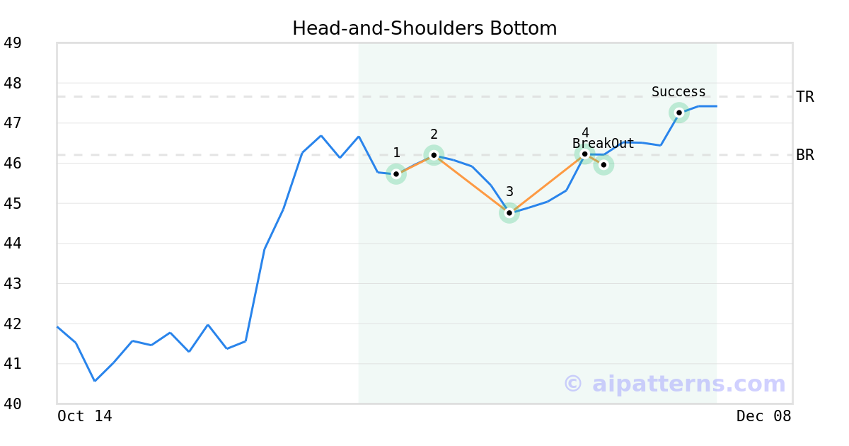 On November 24, 2025, A.I.dvisor detected a Head-and-Shoulders Bottom Pattern (Bullish) for Bank of NT Butterfield & Son Limited (The) (NTB, $45.95). On November 24, 2025, A.I.dvisor confirmed the Bullish pattern, setting a target price of $47.66. 7 days later, on December 01, 2025, NTB reached the target price resulting in a for traders who took a long position in the stock.