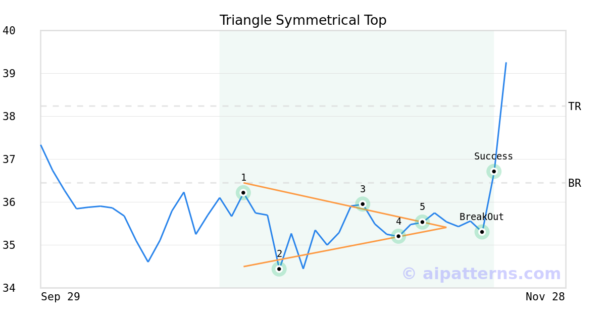 On November 12, 2025, A.I.dvisor detected a Triangle Symmetrical Top Pattern (Bullish) for Ohio Valley Banc Corp (OVBC, $35.53). On November 19, 2025, A.I.dvisor confirmed the Bullish pattern, setting a target price of $38.24. 1 day later, on November 20, 2025, OVBC reached the target price resulting in a for traders who took a long position in the stock.