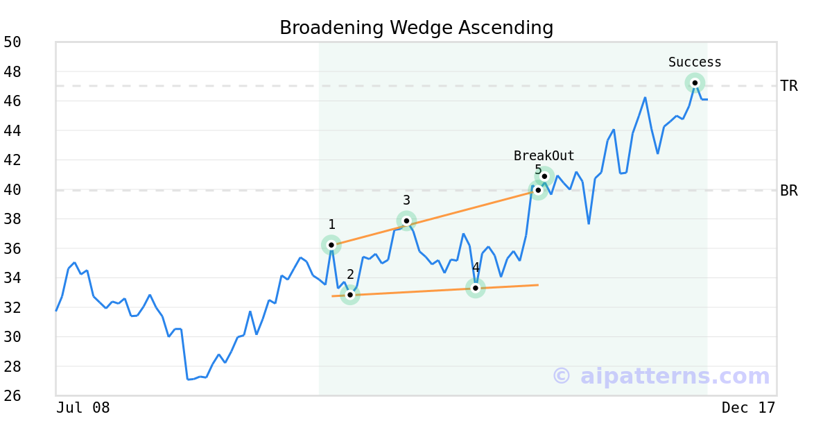 On October 24, 2025, A.I.dvisor detected a Broadening Wedge Ascending Pattern (Bullish) for Par Pacific Holdings (PARR, $39.92). On October 27, 2025, A.I.dvisor confirmed the Bullish pattern, setting a target price of $47.02. 35 days later, on December 01, 2025, PARR reached the target price resulting in a +1 for traders who took a long position in the stock.
