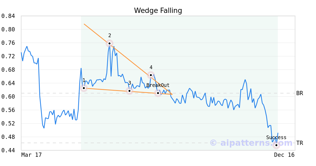 On August 04, 2025, A.I.dvisor detected a Wedge Falling Pattern (Bearish) for PEDEVCO Corp (PED, $0.61). On August 04, 2025, A.I.dvisor confirmed the Bearish pattern, setting a target price of the stock. On November 28, 2025, the stock hit the target price of $0.46 – resulting in a +2 gain for traders who shorted the stock on the pattern detection date.