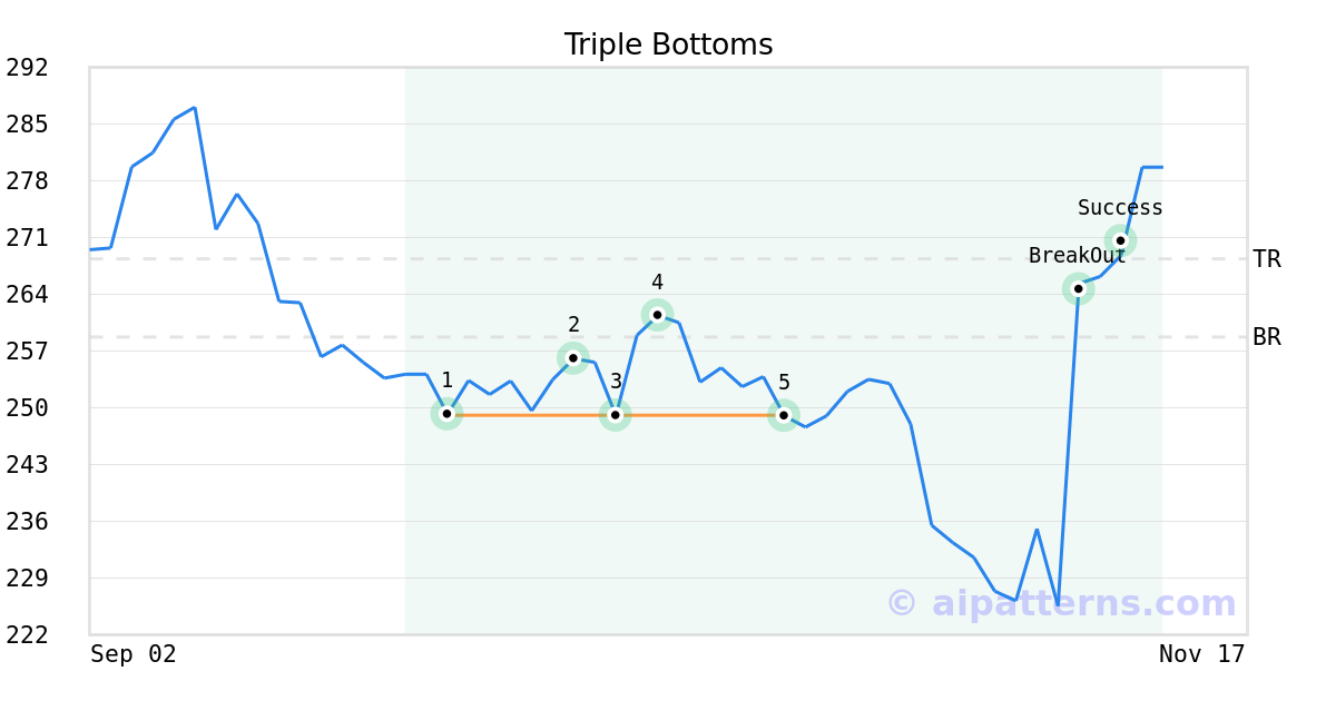 On October 17, 2025, A.I.dvisor detected a Triple Bottoms Pattern (Bullish) for Penumbra (PEN, $249.00). On November 06, 2025, A.I.dvisor confirmed the Bullish pattern, setting a target price of $268.37. 4 days later, on November 10, 2025, PEN reached the target price resulting in a for traders who took a long position in the stock.
