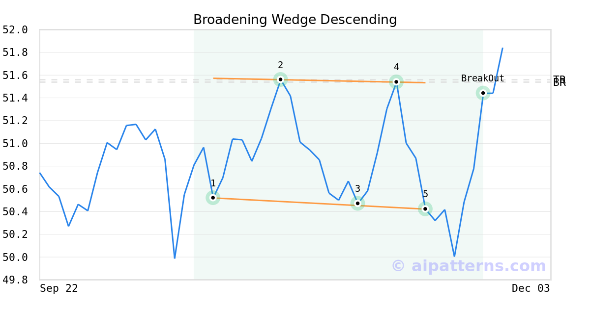 On November 17, 2025, A.I.dvisor detected a Broadening Wedge Descending Pattern (Bullish) for Invesco Dividend Achievers™ ETF (PFM, $50.42). On November 25, 2025, A.I.dvisor confirmed the Bullish pattern, setting a target price of $51.56. On November 25, 2025, PFM reached the target price resulting in a for traders who took a long position in the stock.