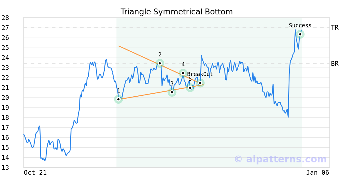 On June 20, 2025, A.I.dvisor detected a Triangle Symmetrical Bottom Pattern (Bullish) for Progyny (PGNY, $20.98). On July 07, 2025, A.I.dvisor confirmed the Bullish pattern, setting a target price of $27.02. 140 days later, on November 24, 2025, PGNY reached the target price resulting in a +2 for traders who took a long position in the stock.