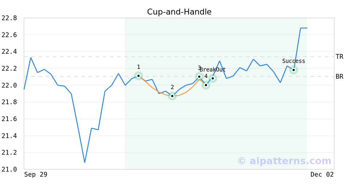 On November 05, 2025, A.I.dvisor detected a Cup-and-Handle Pattern (Bullish) for Plymouth Industrial REIT (PLYM, $22.00). On November 06, 2025, A.I.dvisor confirmed the Bullish pattern, setting a target price of $22.34. 18 days later, on November 24, 2025, PLYM reached the target price resulting in a for traders who took a long position in the stock.