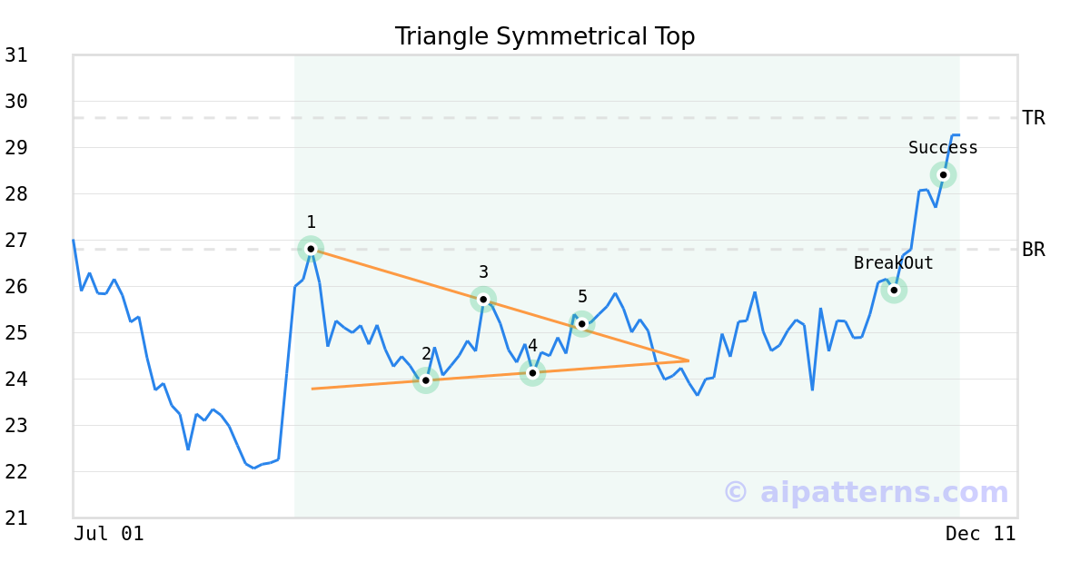 On September 29, 2025, A.I.dvisor detected a Triangle Symmetrical Top Pattern (Bullish) for Pennant Group (The) (PNTG, $25.18). On November 20, 2025, A.I.dvisor confirmed the Bullish pattern, setting a target price of $29.64. 11 days later, on December 01, 2025, PNTG reached the target price resulting in a +1 for traders who took a long position in the stock.
