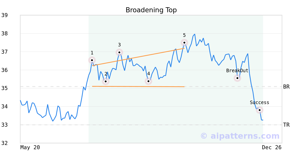 On October 07, 2025, A.I.dvisor detected a Broadening Top Pattern (Bearish) for PPL Corp (PPL, $37.49). 43 days later, on November 19, 2025, A.I.dvisor confirmed the Bearish pattern, setting a target price of the stock. On December 09, 2025, the stock hit the target price of $33.00 – resulting in a gain for traders who shorted the stock on the pattern detection date.