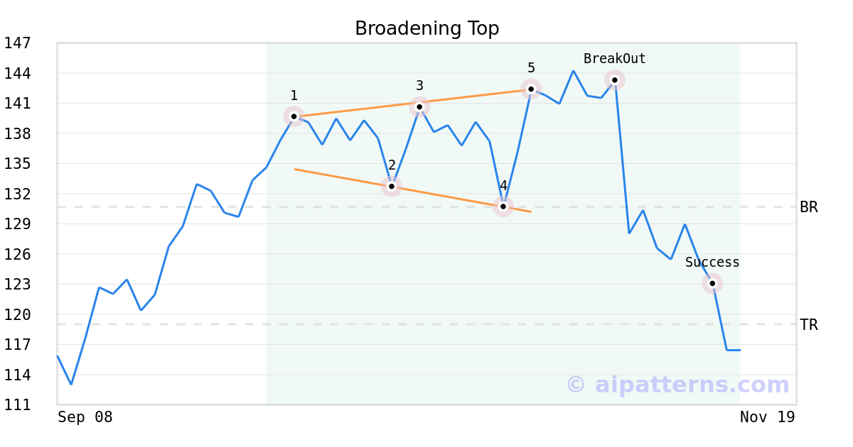 On October 24, 2025, A.I.dvisor detected a Broadening Top Pattern (Bearish) for Primoris Services Corp (PRIM, $142.37). 10 days later, on November 03, 2025, A.I.dvisor confirmed the Bearish pattern, setting a target price of the stock. On November 12, 2025, the stock hit the target price of $119.01 – resulting in a +1 gain for traders who shorted the stock on the pattern detection date.