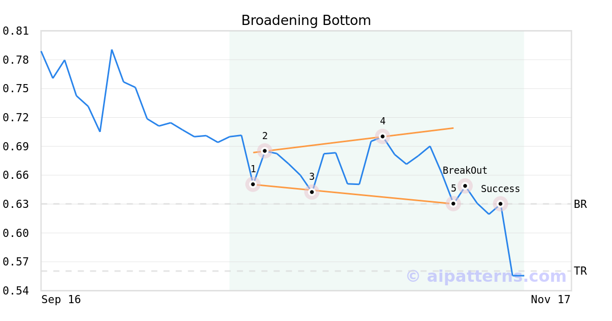 On November 04, 2025, A.I.dvisor detected a Broadening Bottom Pattern (Bearish) for CarParts.com (PRTS, $0.63). 1 day later, on November 05, 2025, A.I.dvisor confirmed the Bearish pattern, setting a target price of the stock. On November 10, 2025, the stock hit the target price of $0.56 – resulting in a gain for traders who shorted the stock on the pattern detection date.