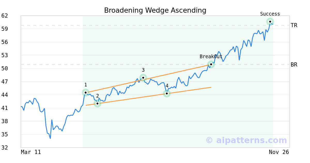 On September 15, 2025, A.I.dvisor detected a Broadening Wedge Ascending Pattern (Bullish) for Invesco S&P SmallCap Info Tech ETF (PSCT, $50.90). On September 15, 2025, A.I.dvisor confirmed the Bullish pattern, setting a target price of $59.80. 56 days later, on November 10, 2025, PSCT reached the target price resulting in a +1 for traders who took a long position in the stock.