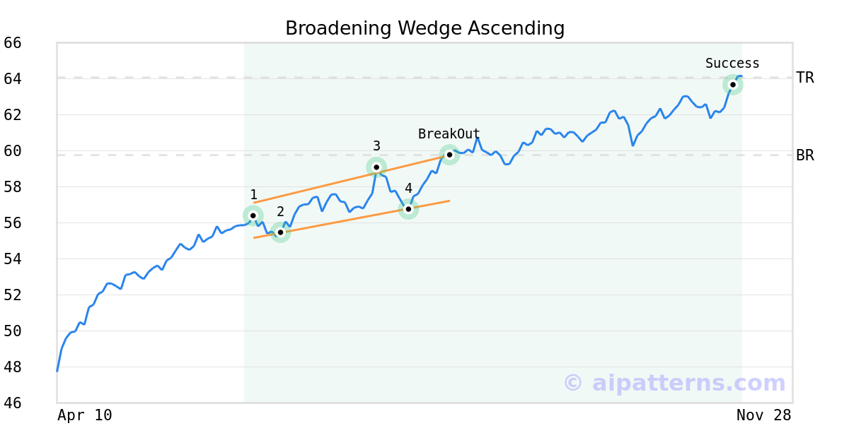 On August 14, 2025, A.I.dvisor detected a Broadening Wedge Ascending Pattern (Bullish) for Invesco RAFI Developed Markets ex-US ETF (PXF, $59.76). On August 14, 2025, A.I.dvisor confirmed the Bullish pattern, setting a target price of $64.07. 89 days later, on November 11, 2025, PXF reached the target price resulting in a for traders who took a long position in the stock.