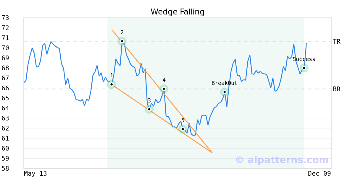 On September 02, 2025, A.I.dvisor detected a Wedge Falling Pattern (Bullish) for Restaurant Brands International (QSR, $61.90). On September 29, 2025, A.I.dvisor confirmed the Bullish pattern, setting a target price of $70.66. 52 days later, on November 20, 2025, QSR reached the target price resulting in a for traders who took a long position in the stock.
