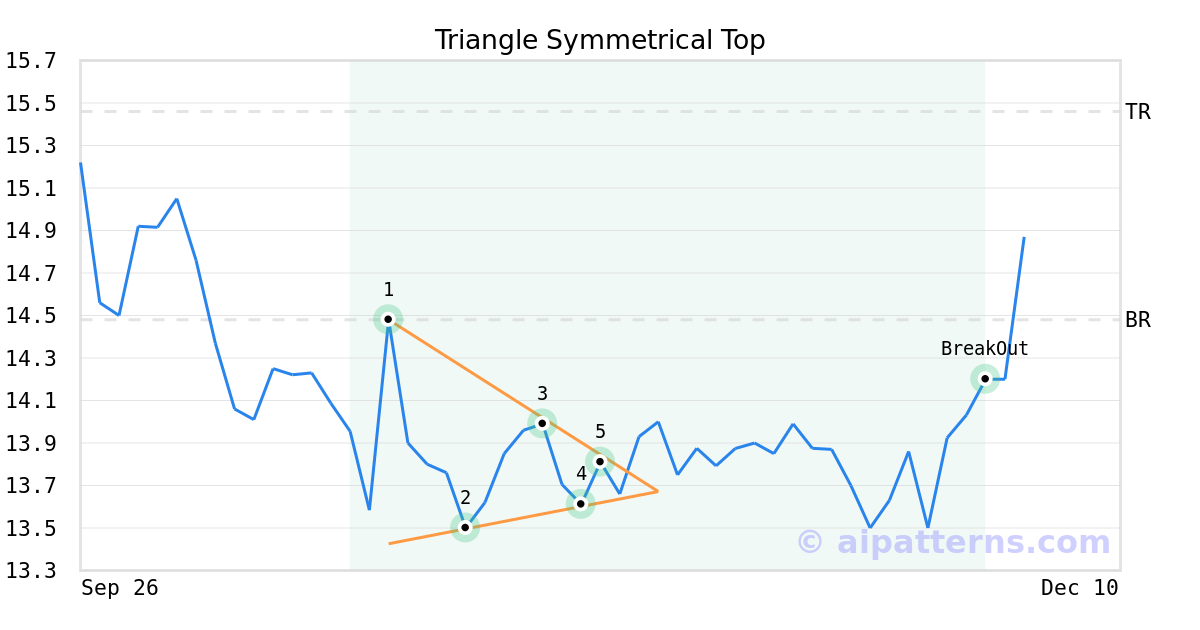 On November 04, 2025, A.I.dvisor detected a Triangle Symmetrical Top Pattern (Bullish) for Rand Capital Corp (RAND, $13.81). On December 03, 2025, A.I.dvisor confirmed the Bullish pattern, setting a target price of $15.46. On December 03, 2025, RAND reached the target price resulting in a for traders who took a long position in the stock.