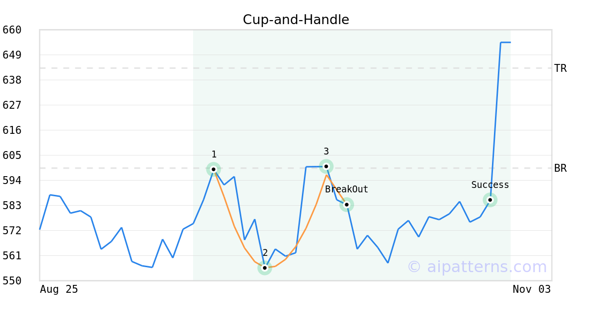On October 07, 2025, A.I.dvisor detected a Cup-and-Handle Pattern (Bullish) for Regeneron Pharmaceuticals (REGN, $583.24). On October 07, 2025, A.I.dvisor confirmed the Bullish pattern, setting a target price of $643.20. 20 days later, on October 27, 2025, REGN reached the target price resulting in a for traders who took a long position in the stock.