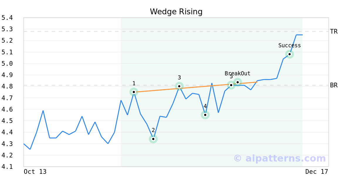 On November 26, 2025, A.I.dvisor detected a Wedge Rising Pattern (Bullish) for Resources Connection (RGP, $4.81). On November 28, 2025, A.I.dvisor confirmed the Bullish pattern, setting a target price of $5.28. 12 days later, on December 10, 2025, RGP reached the target price resulting in a for traders who took a long position in the stock.