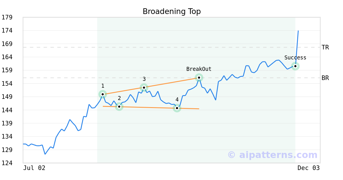 On October 02, 2025, A.I.dvisor detected a Broadening Top Pattern (Bullish) for Ross Stores (ROST, $156.17). On October 02, 2025, A.I.dvisor confirmed the Bullish pattern, setting a target price of $167.67. 49 days later, on November 20, 2025, ROST reached the target price resulting in a for traders who took a long position in the stock.