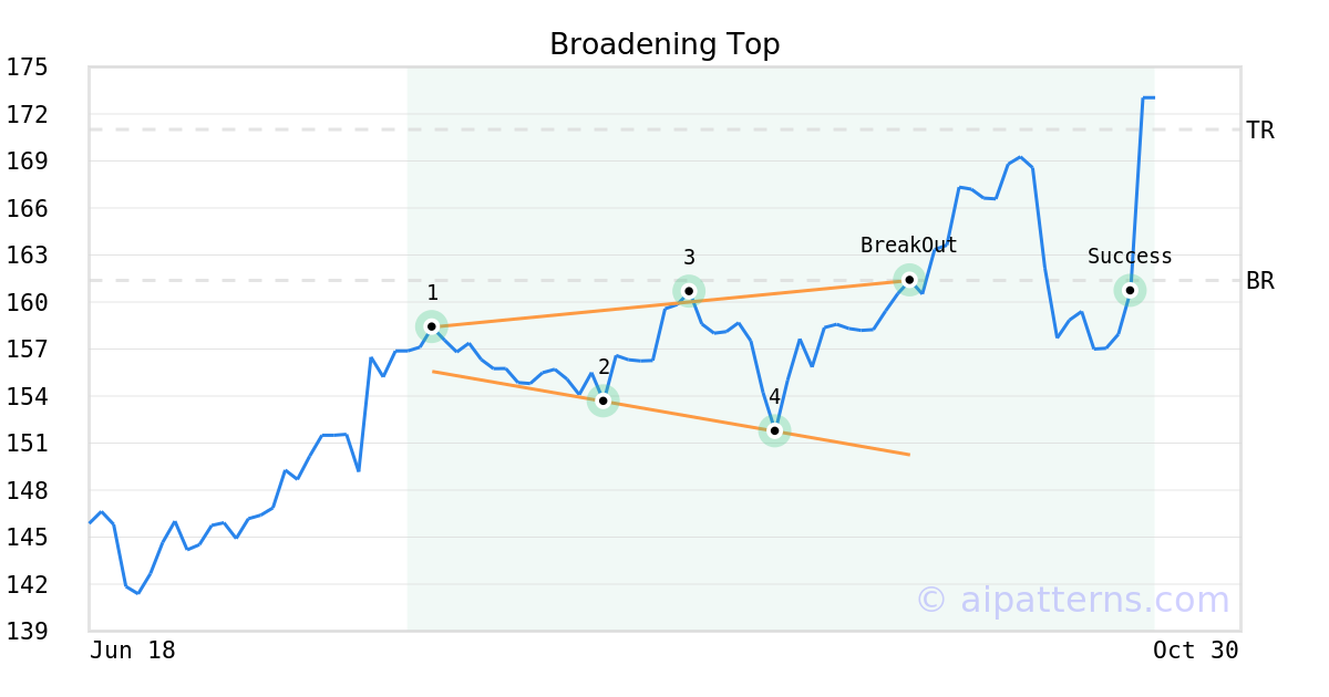 On September 24, 2025, A.I.dvisor detected a Broadening Top Pattern (Bullish) for RTX Corp (RTX, $161.38). On September 24, 2025, A.I.dvisor confirmed the Bullish pattern, setting a target price of $171.01. 26 days later, on October 20, 2025, RTX reached the target price resulting in a for traders who took a long position in the stock.