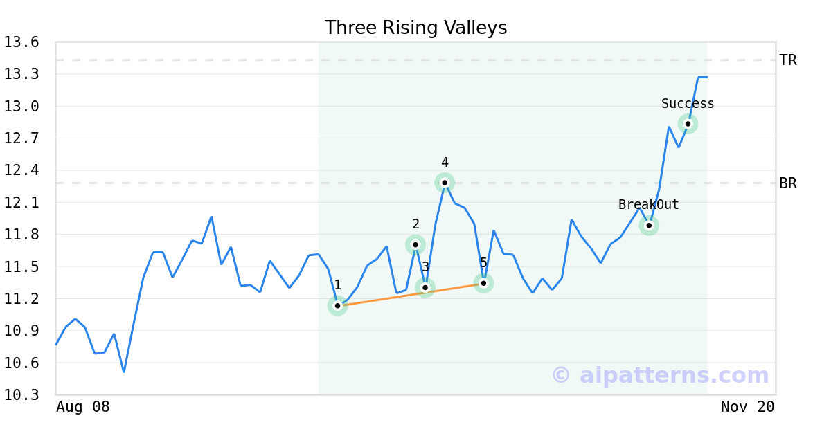 On October 10, 2025, A.I.dvisor detected a Three Rising Valleys Pattern (Bullish) for SandRidge Energy (SD, $11.34). On November 04, 2025, A.I.dvisor confirmed the Bullish pattern, setting a target price of $13.43. 6 days later, on November 10, 2025, SD reached the target price resulting in a +1 for traders who took a long position in the stock.