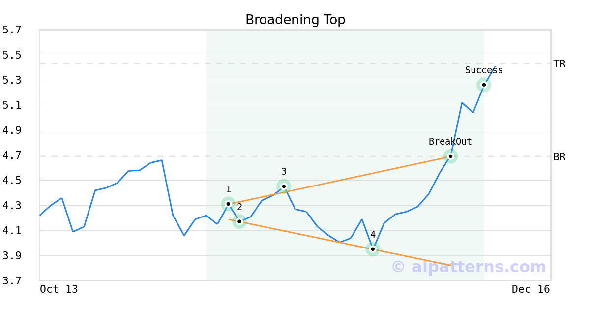 On December 04, 2025, A.I.dvisor detected a Broadening Top Pattern (Bullish) for Stitch Fix (SFIX, $4.69). On December 04, 2025, A.I.dvisor confirmed the Bullish pattern, setting a target price of $5.43. 5 days later, on December 09, 2025, SFIX reached the target price resulting in a +1 for traders who took a long position in the stock.