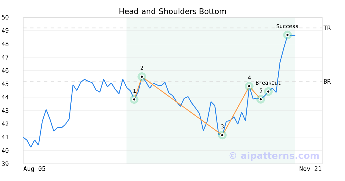 On October 31, 2025, A.I.dvisor detected a Head-and-Shoulders Bottom Pattern (Bullish) for Southern First Bancshares (SFST, $43.84). On November 04, 2025, A.I.dvisor confirmed the Bullish pattern, setting a target price of $49.21. 7 days later, on November 11, 2025, SFST reached the target price resulting in a +1 for traders who took a long position in the stock.